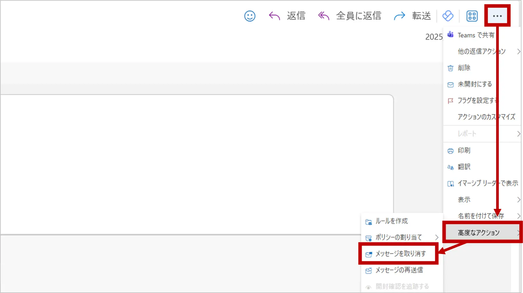 メールの詳細画面にある「…」>「高度なアクション」>「メッセージを取り消す」を選択。