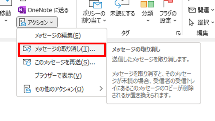 「メッセージ」タブ>「アクション」>「メッセージの取り消し」を選択。