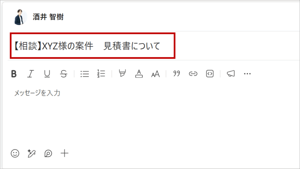 チャネルでは「件名」を追加できます。 メールのように投稿内容に関する件名に入れるだけで、相手は通知を見た瞬間に優先度を判断でき、素早くコミュニケーションをとることができます。