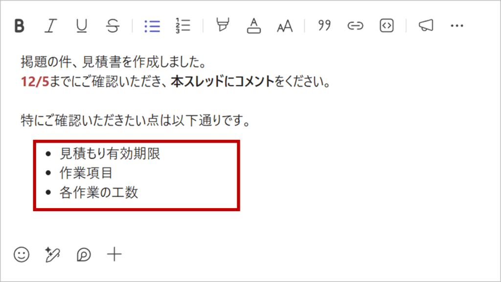 依頼事項や質問が複数ある場合は、ツールバーの「箇条書き」や「番号付きリスト」を使いましょう。