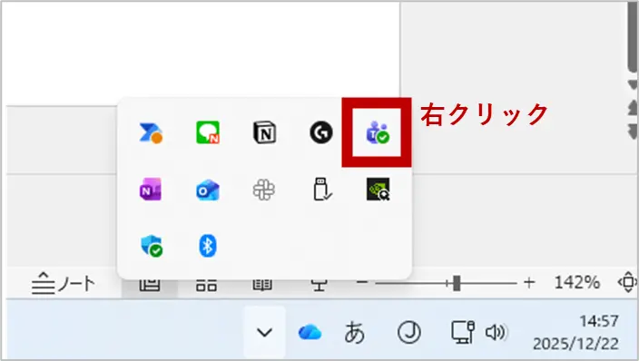 Teamsは画面右上の「×」を押しても、裏側で動き続けています(常駐しています)。