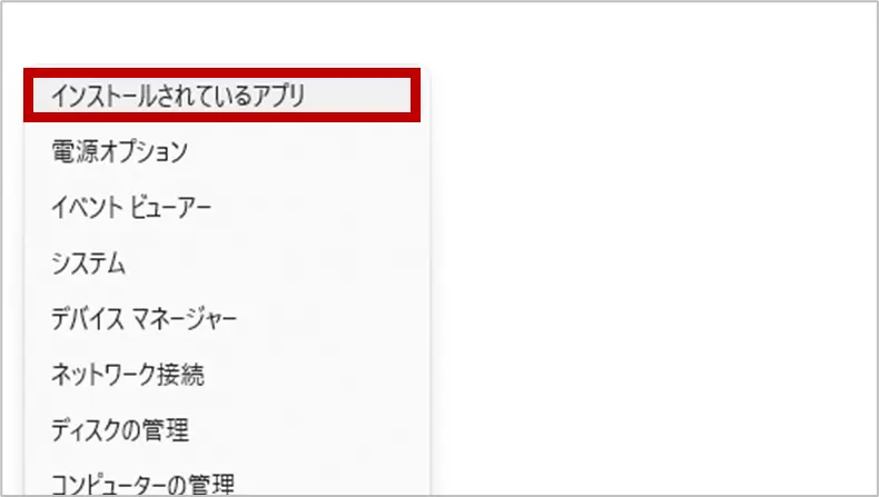 Windowsのスタートボタンを右クリックし、「インストールされているアプリ(またはアプリと機能)」を選択します。
