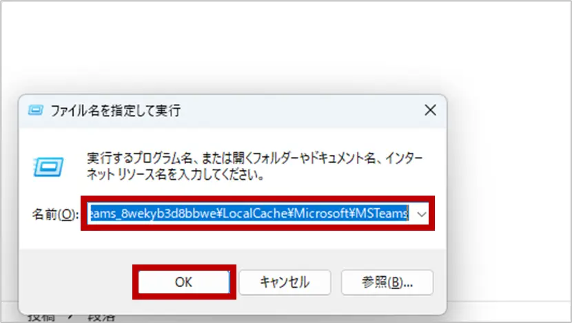 「ファイル名を指定して実行」画面に以下をコピペして「OK」を押します。 %userprofile%\appdata\local\Packages\MSTeams_8wekyb3d8bbwe\LocalCache\Microsoft\MSTeams