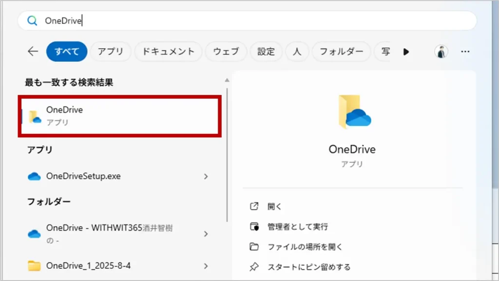 見当たらない場合は、スタートメニューから「OneDrive」を検索して起動します。