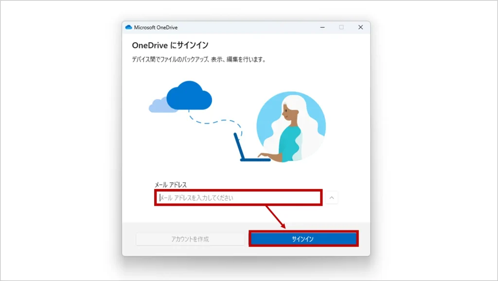 サインイン画面が表示されたら、あなたのMicrosoft 365のメールアドレスを入力し、「サインイン」をクリックします。パスワードを入力し、画面の指示に沿って進めていくと、同期の設定が完了します。