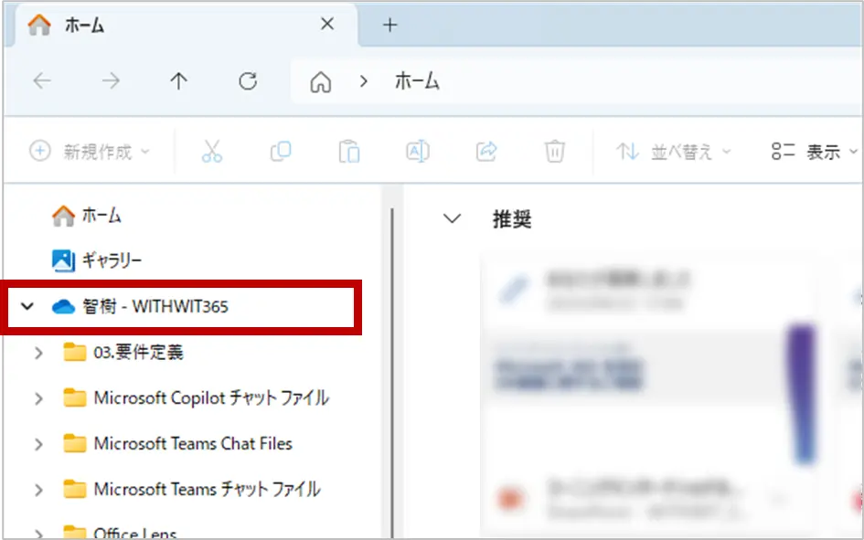 完了後、エクスプローラーを開くと、左側のナビゲーションウィンドウに「ユーザー表示名 - [会社名]」のフォルダが表示されていることが確認できます。