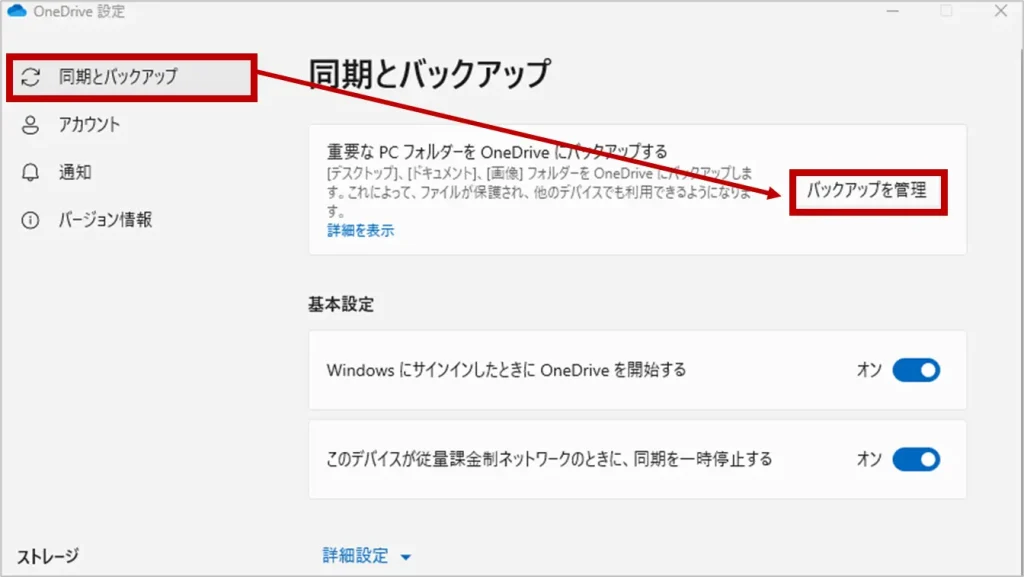 「同期とバックアップ」> 「バックアップを管理」をクリックします。
