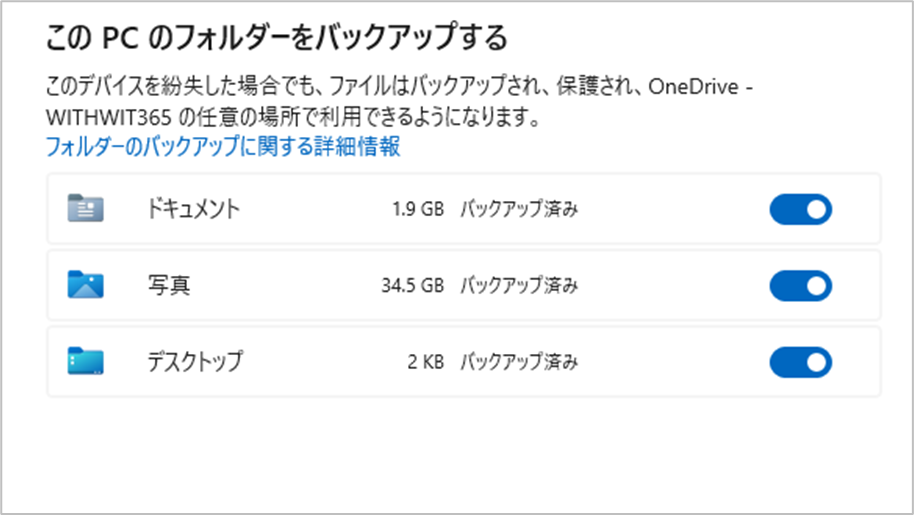 同期したいフォルダ(ドキュメント、写真、デスクトップ)のトグルをONにします。