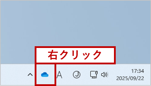 PCの画面右下にあるタスクバーの通知領域から、青色または灰色の「雲」のアイコンを探してクリックします。
