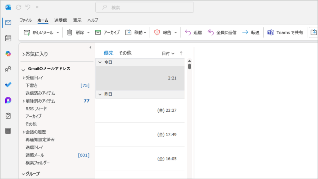 Outlook(classic)を起動し、対象のアカウントが表示されていることを確認します。