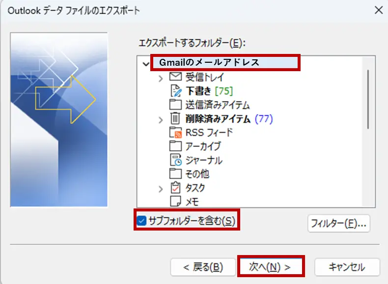 ※ 複数のサブフォルダーも含めてエクスポートする場合は、「サブフォルダーを含める」にチェックを入れてください。最後に「次へ」をクリックします。