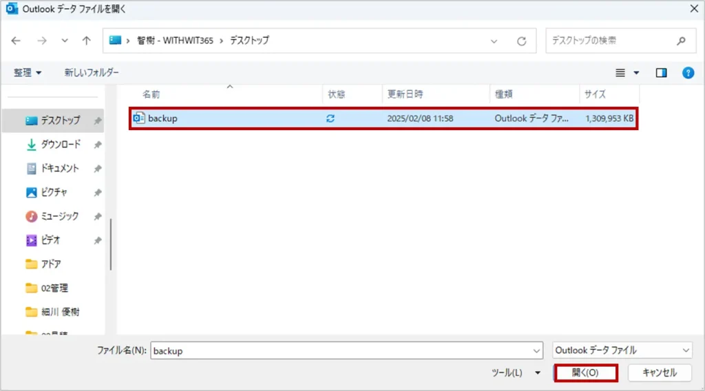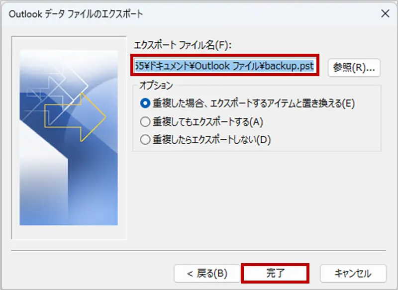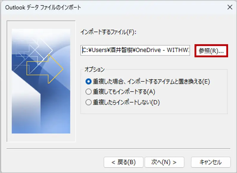 「参照」ボタンをクリックして、先ほどエクスポートしたPSTファイルを選択します。