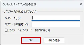 必要に応じて、PSTファイルにパスワードを設定できます(任意)。パスワードを設定しない場合はパスワードを入力せず「OK」をクリックします。