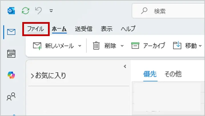 Outlook(classic)を起動し、Outlookの上部にある「ファイル」タブをクリックします。