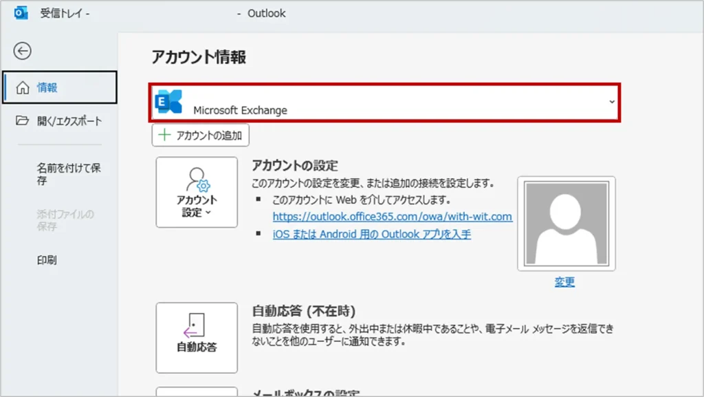 「情報」を選択し、Microsoft 365 アカウントを指定します。Microsoft 365 のメールアカウントは「Microsoft Exchange」という表記があります。