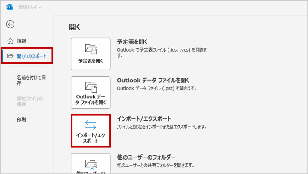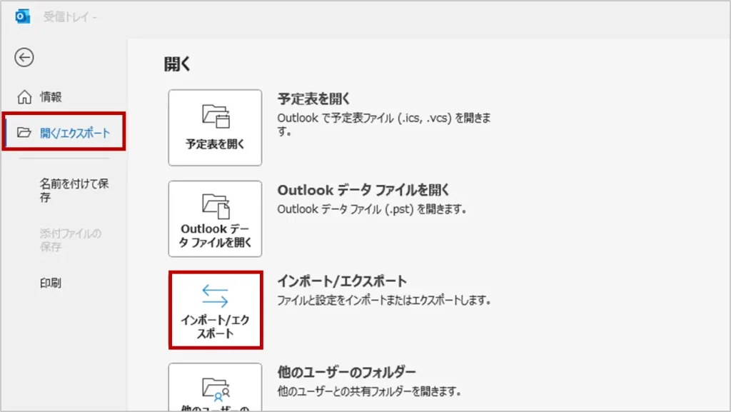 メニューから「開く/エクスポート」を選択し、「インポート/エクスポート」をクリックします。