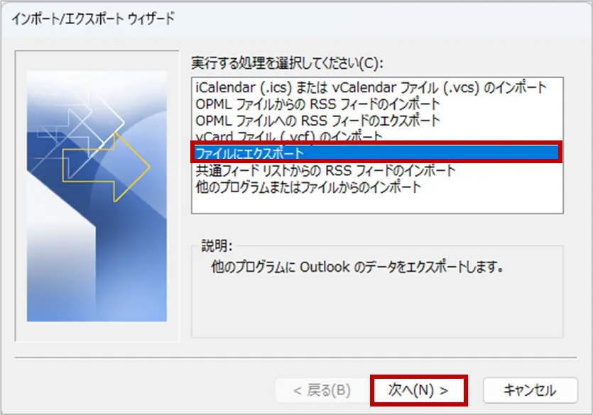表示される「インポート/エクスポートウィザード」で、「ファイルへエクスポート」を選択し、「次へ」をクリックします。