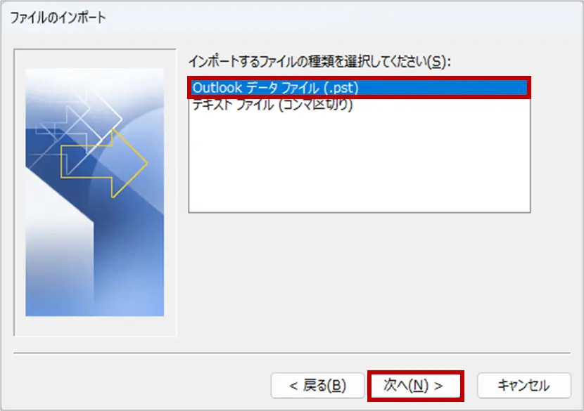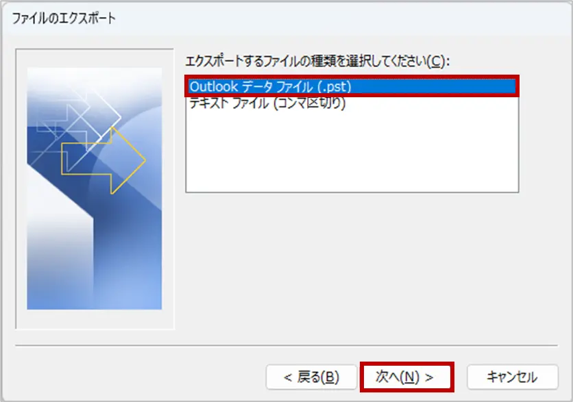 「Outlookデータファイル(.pst)」を選択し、「次へ」をクリックします。