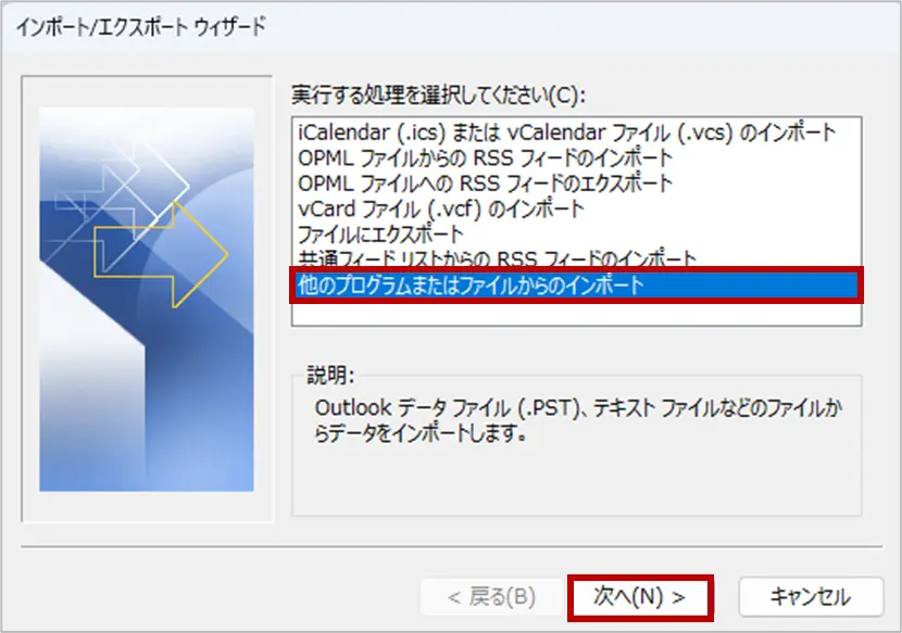 「インポート/エクスポートウィザード」で、「他のプログラムまたはファイルからのインポート」を選択し、「次へ」をクリックします。