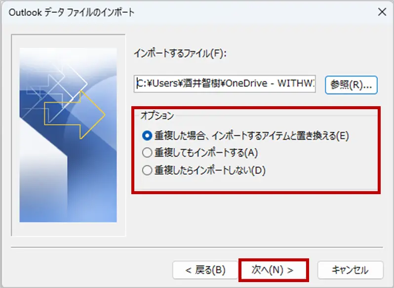 インポートオプションで、「重複するアイテムを作成する」、「重複するアイテムを置換する」、または「重複するアイテムをインポートしない」の中から適切な項目を選択し、「次へ」をクリックします。
