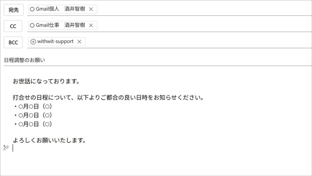 見積書や請求書の送付状、新規の案内メール、上司への日報(BCCに他部署のマネージャーも入れる)など、「新規作成」する定型文については、この機能を活用することで、メール作成の時間を大幅に短縮し、宛先漏れなどのミスも防ぐことができます。 「返信」での利用については、今後のMicrosoftのアップデートに期待しましょう。