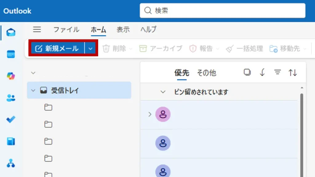 「新しいOutlook」で、「新規メール」ボタンを押し、メール作成画面を開きます。