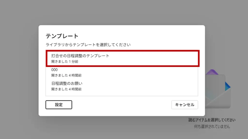 これをクリックすると、先ほど保存したテンプレートの一覧が表示されるので、使用したいテンプレートをクリックします。