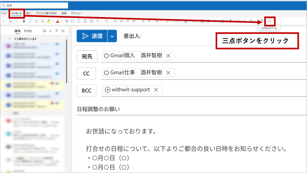 メッセージタブ(上部メニュー)にある「・・・」(三点ボタン)をクリックします。