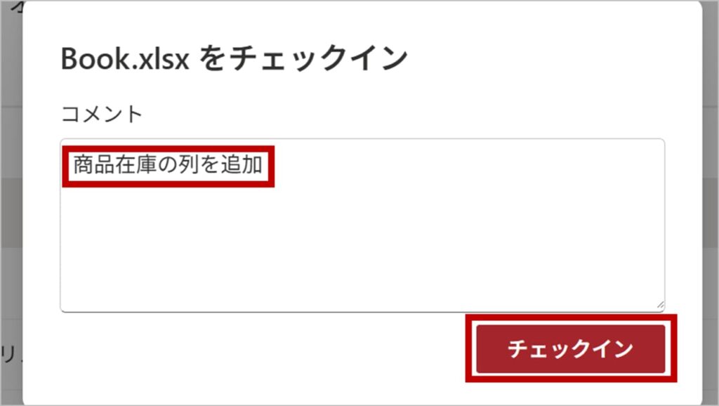 コメント入力画面が表示されます。「商品在庫の列を追加」など、変更内容をメモして「チェックイン」をクリックします。