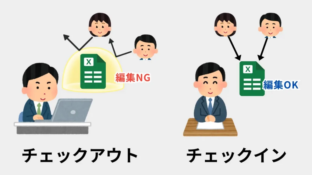 ファイルを「自分専用」にロックすることです。 チェックアウトしたファイルは、他のユーザーからは「読み取り専用」となり、変更を加えることができません。図書館で本を借りている間は、他の人がその本を借りられないのと同じイメージです。