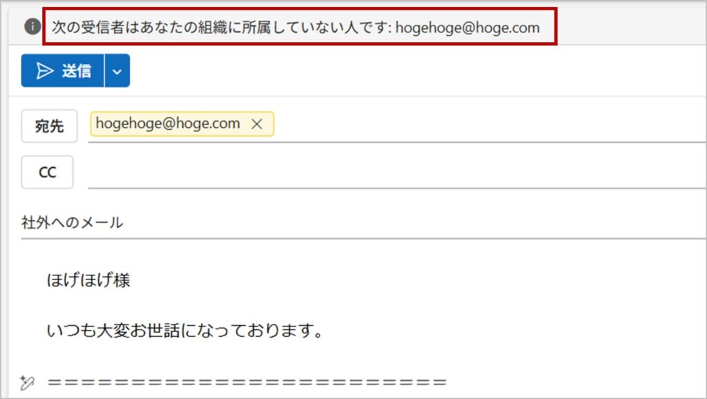 宛先欄に社外ドメインのアドレスを入力した瞬間、ウィンドウ上部に「この受信者はあなたの組織に所属していない人です。」といった警告が表示されます。 - 効果: