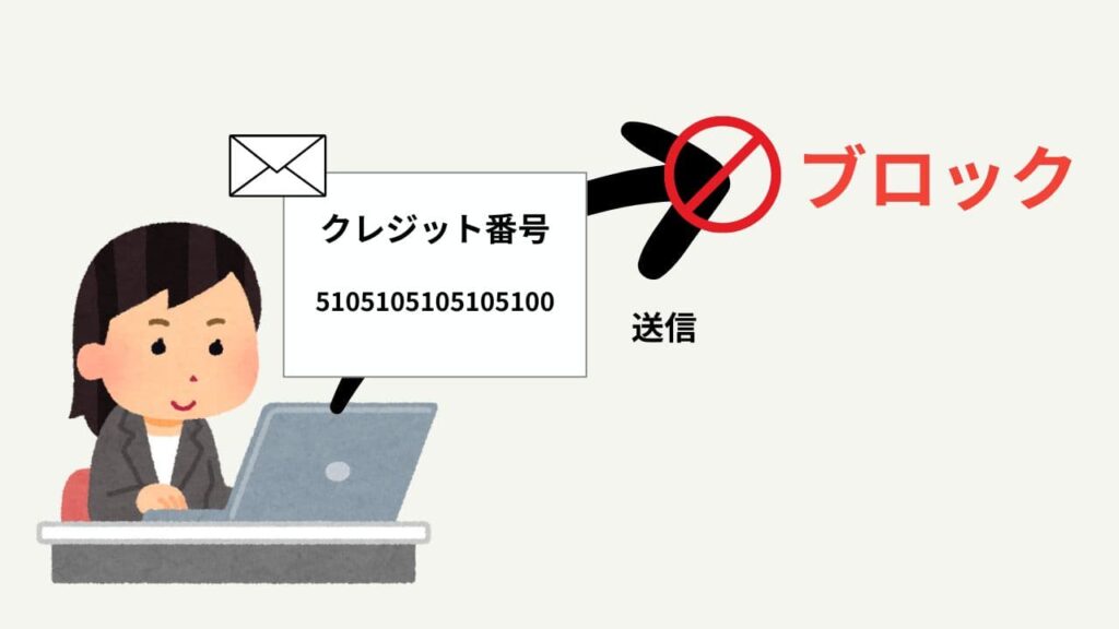 経理担当者が、クレジットカード番号が記載された顧客リストを、誤って社外の取引先にメール送信しようとした。 - DLPの動作: