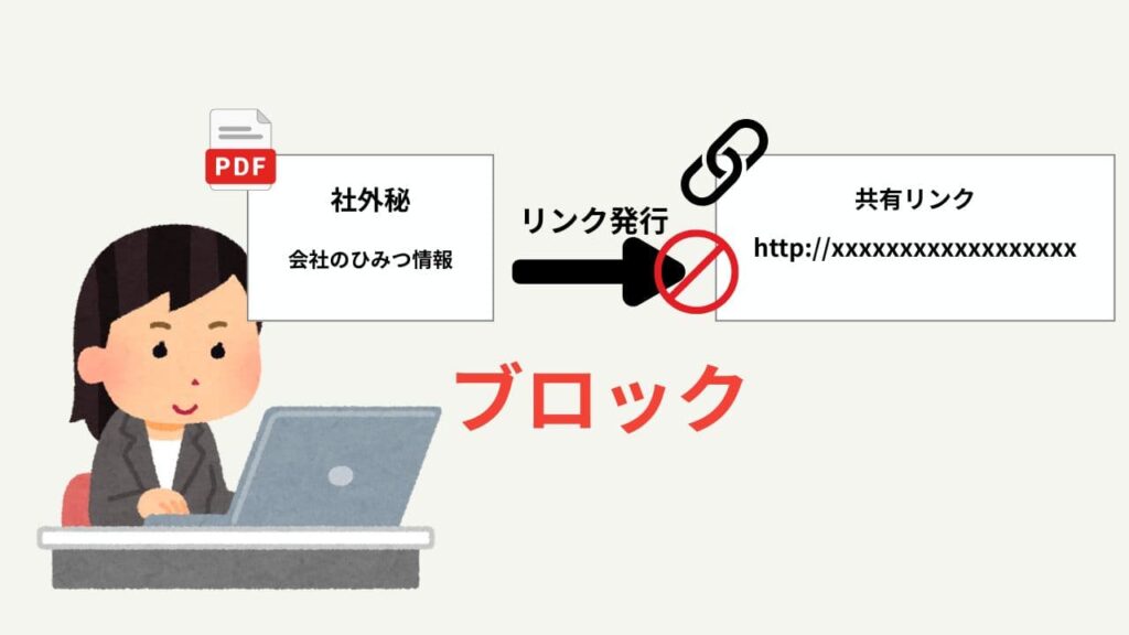 プロジェクトメンバーが、「社外秘」のラベルが付いた設計図データを、誤って「誰でもアクセスできるリンク(匿名リンク)」で外部に共有しようとした。 - DLPの動作: