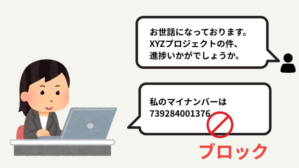 チャットの送信前に内容をスキャンし、マイナンバーのパターンを検出。 「メッセージはブロックされました」と表示され、相手にはメッセージが届きません。 - 効果:
