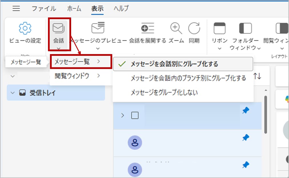 「表示」タブ > 「メッセージ」セクションにある「会話」>「メッセージ一覧」をクリックします。