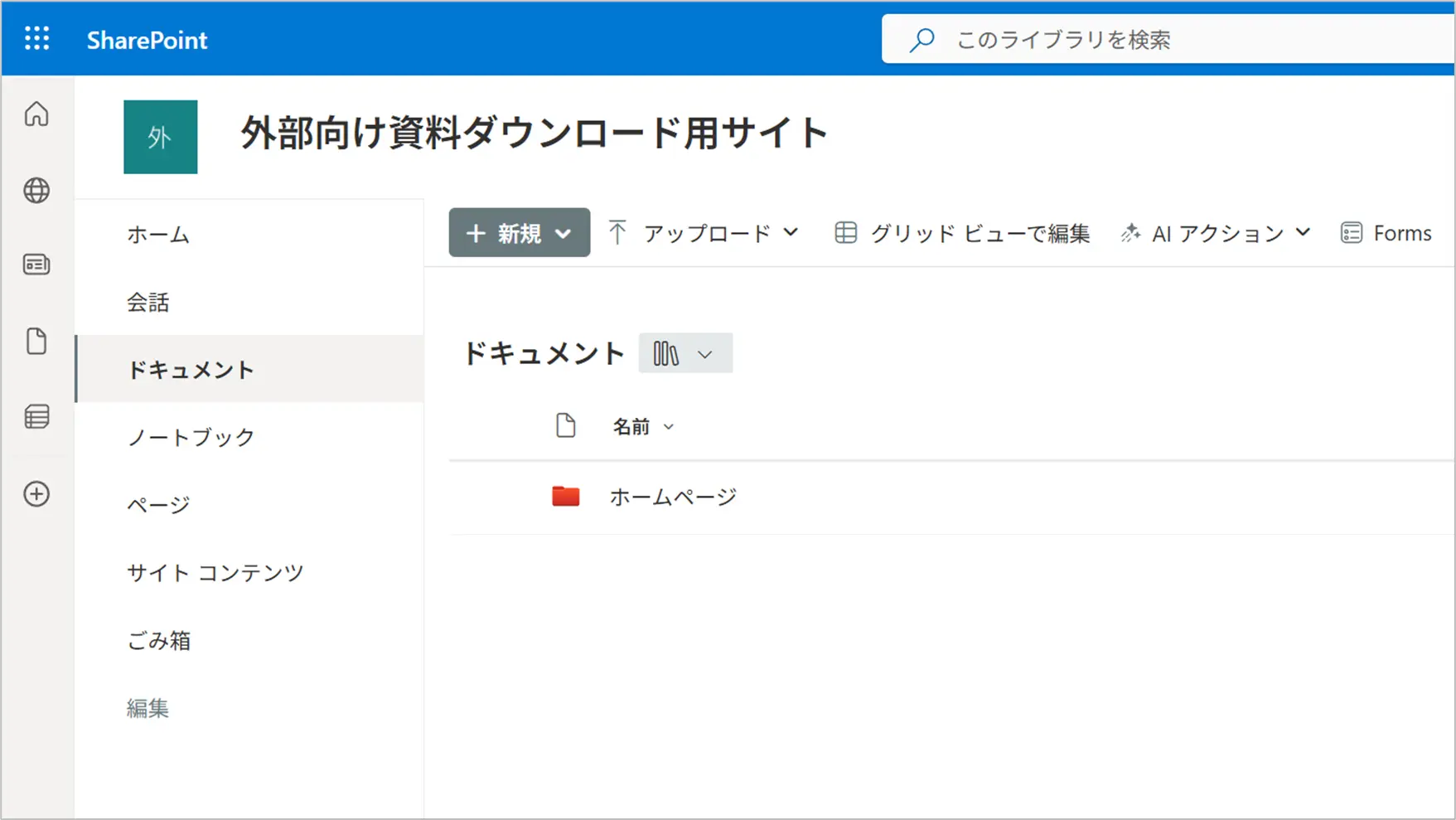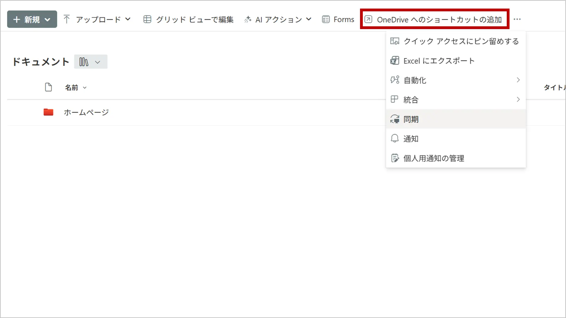 Webブラウザで、同期したいSharePointサイトの「ドキュメント(または同期したいフォルダ)」を開きます。