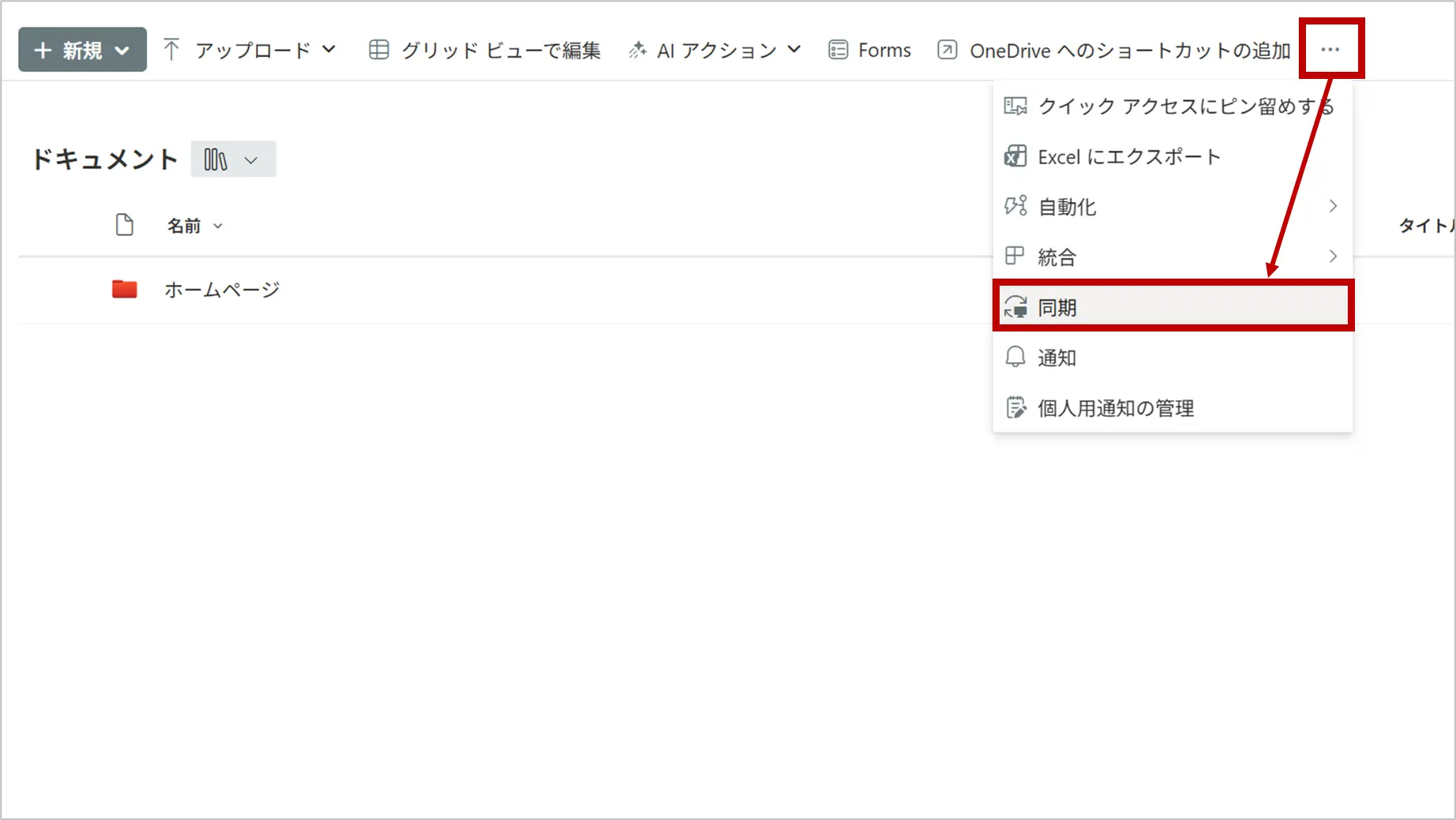 画面上部のメニューバーにある「同期」というボタンをクリックします。 (※メニューが隠れている場合は「・・・」の中にあります)