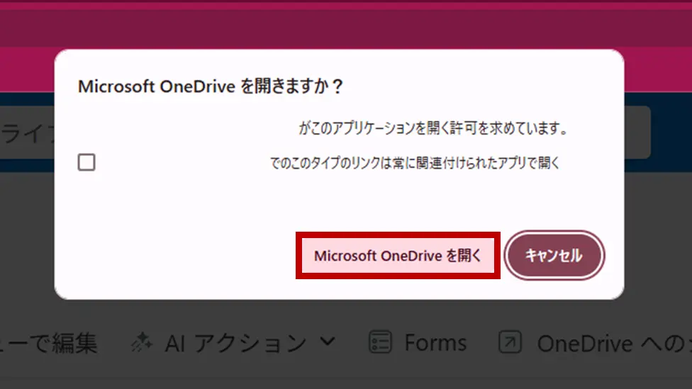 「Microsoft 365 OneDriveを開きますか?」というポップアップが表示されたら、「Microsoft OneDriveを開く」をクリックします。