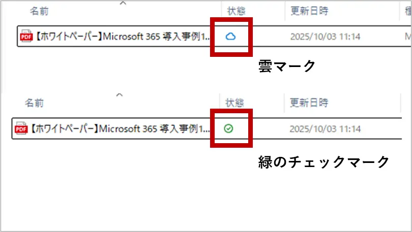 ファイル名だけが見えていて、実体はクラウドにあります。PCの容量は消費しません。ダブルクリックして開いた瞬間にダウンロードされます。 - 緑のチェックマーク(このデバイス上で常に保持):