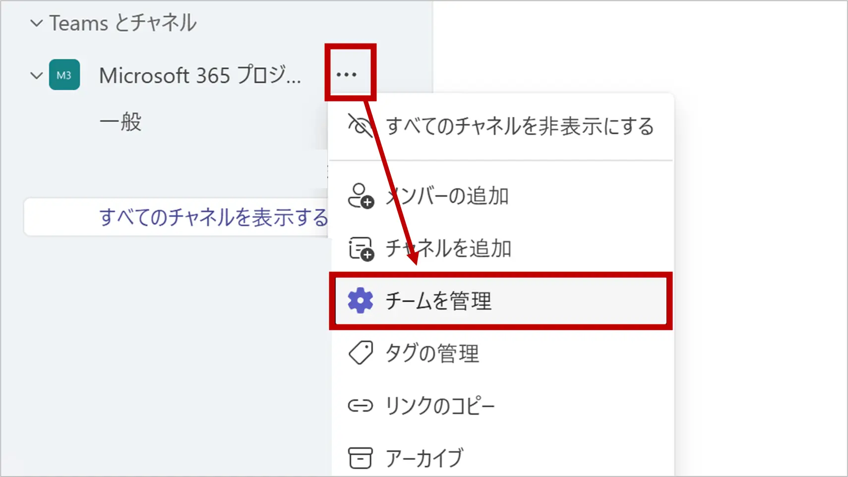 チーム名の横にある「…」をクリックし、「チームを管理」を選択します。