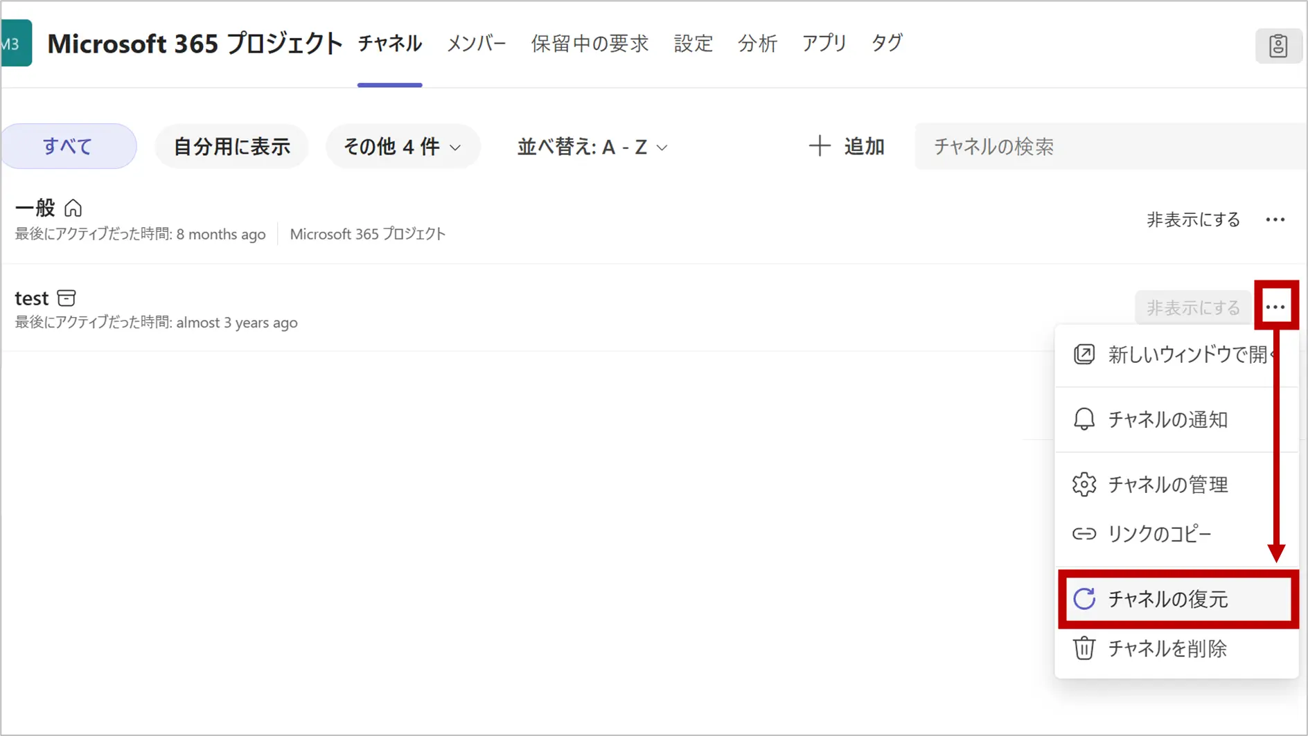 「アーカイブ済み」のリストを開き、対象チャネルの右側にある「…」>「チャネルの復元」をクリックします。