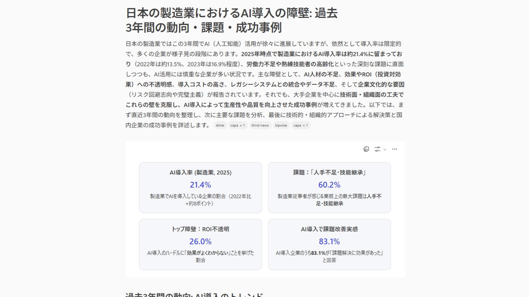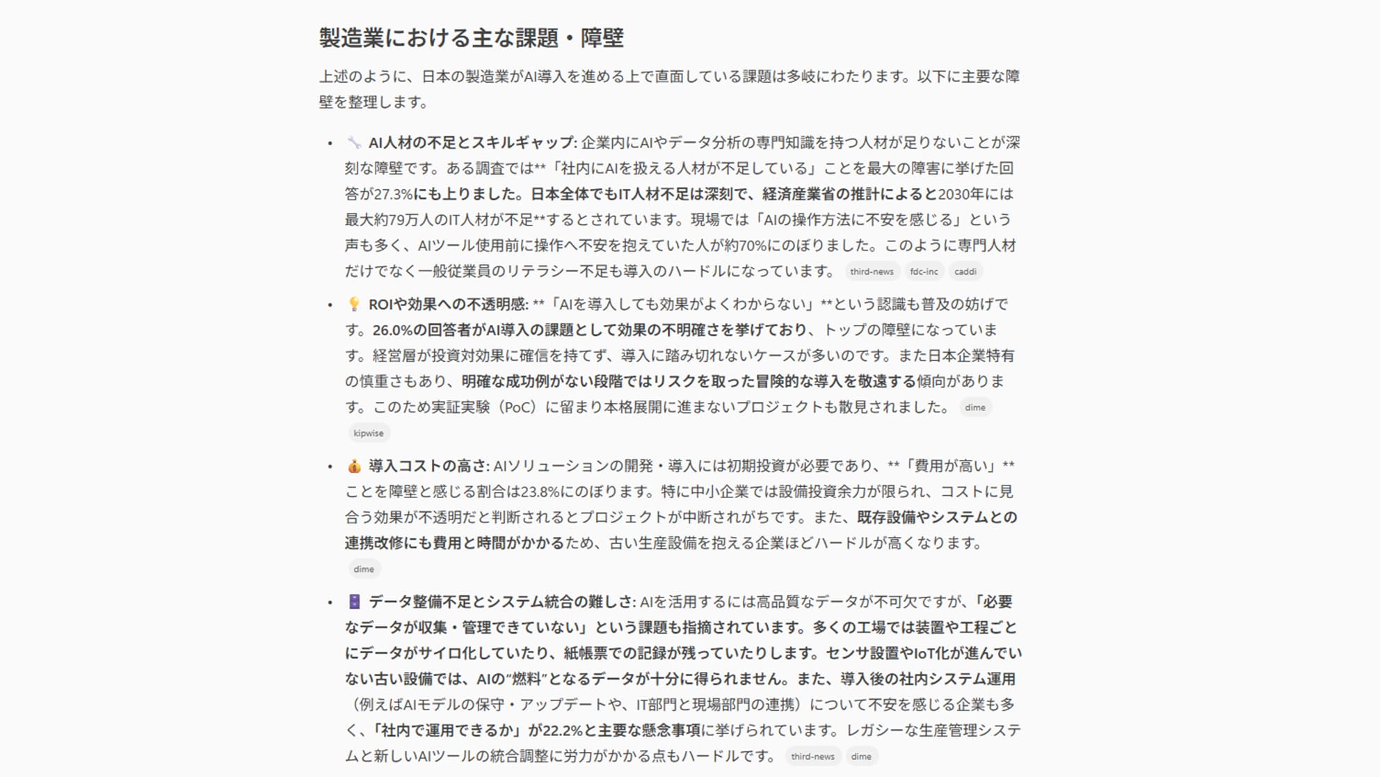 「日本の製造業におけるAI導入の障壁について、過去3年間のトレンド、主な課題、および解決策の成功事例を調査し、詳細なレポートを作成してください。」