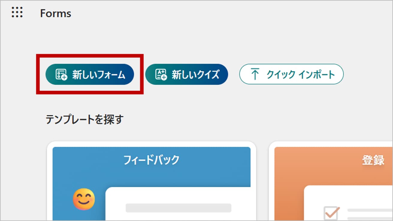 まずはMicrosoft Formsにアクセスし、土台となるフォームを作成しましょう。