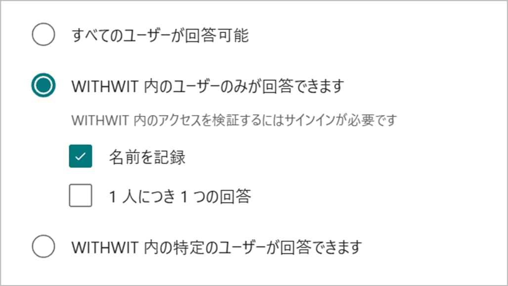 社員限定です。自動的に回答者の名前やメールアドレスが記録されます。 - 自分の組織内の特定のユーザーのみ回答可能できます: