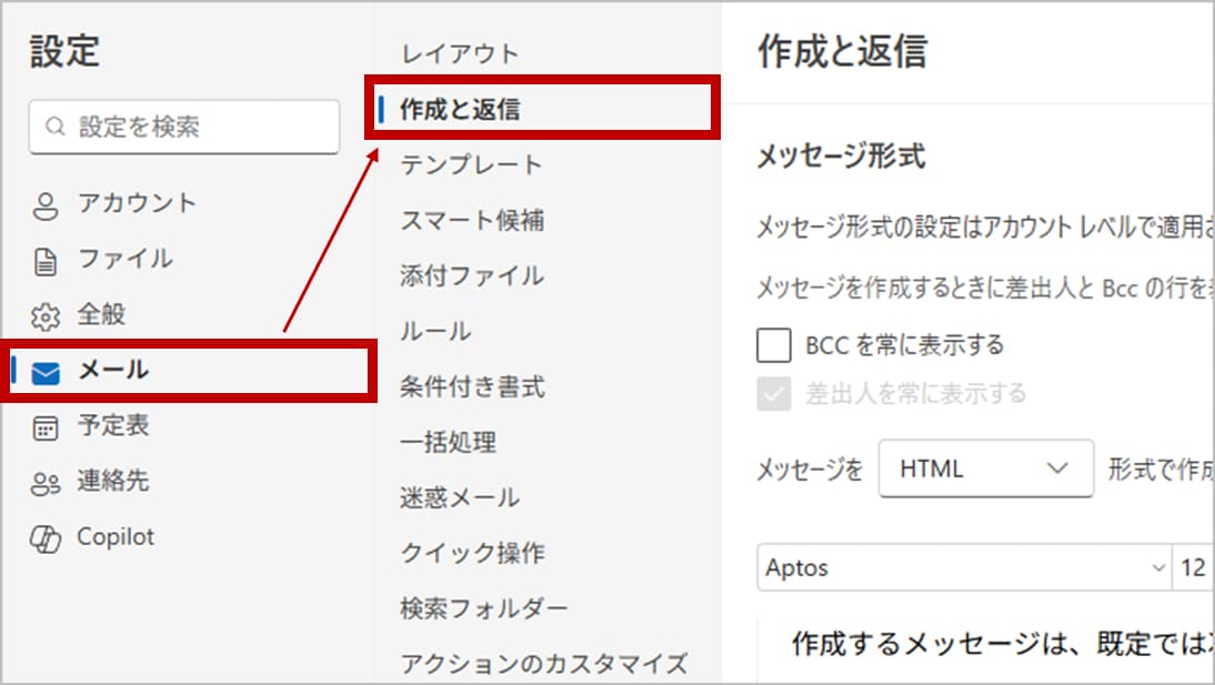 設定メニューが開くので、「メール」 > 「作成と返信」 を選択します。
