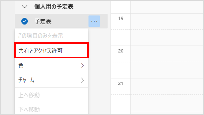 相手側のOutlookで、自分の予定表を右クリック > 「共有とアクセス許可」。