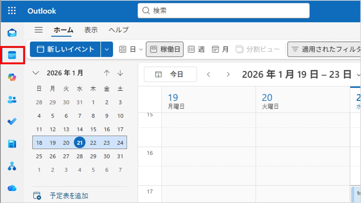 Outlookを起動し、画面左側のナビゲーションバーにある「予定表(カレンダー)」アイコンをクリックします。