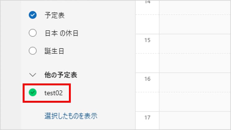 名前の横にあるチェックボックス(〇)をクリックしてオンにすると、その人の予定が自分のカレンダーの隣(または重ねて)表示されます。