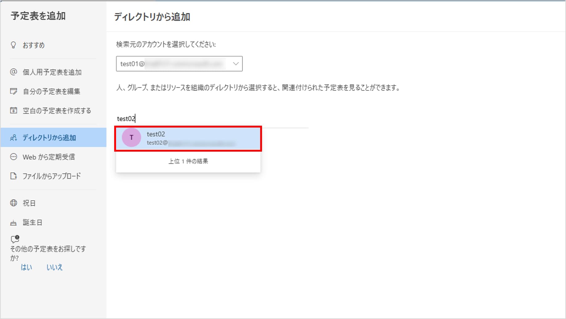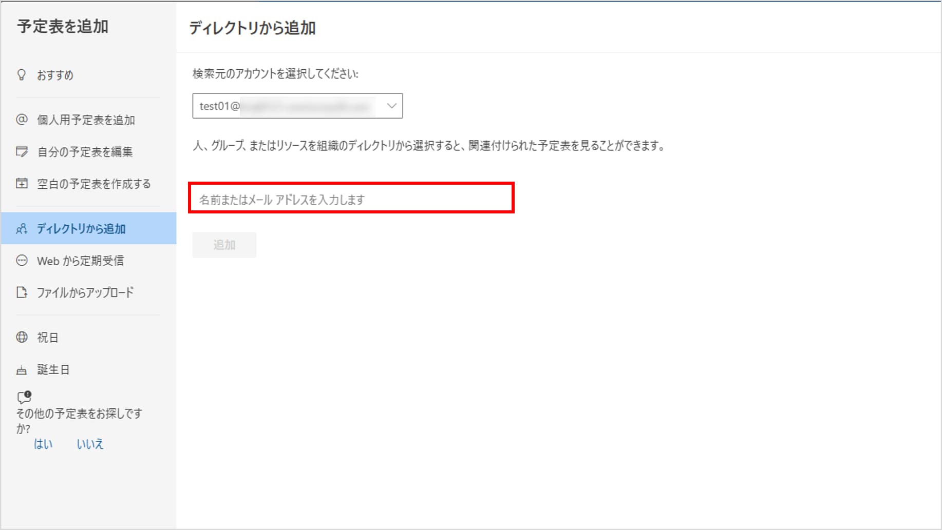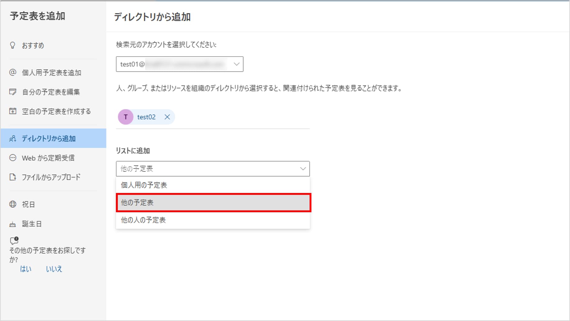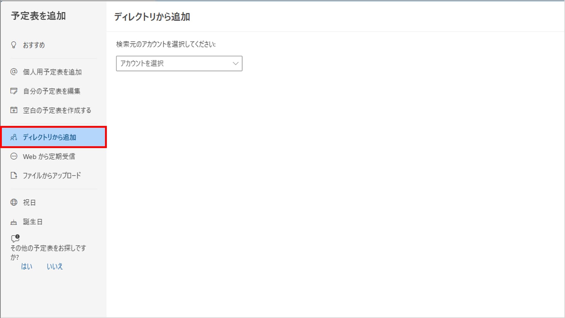 「予定表を追加」というポップアップ画面が開きます。 左側のメニューから「ディレクトリから追加」を選択します。