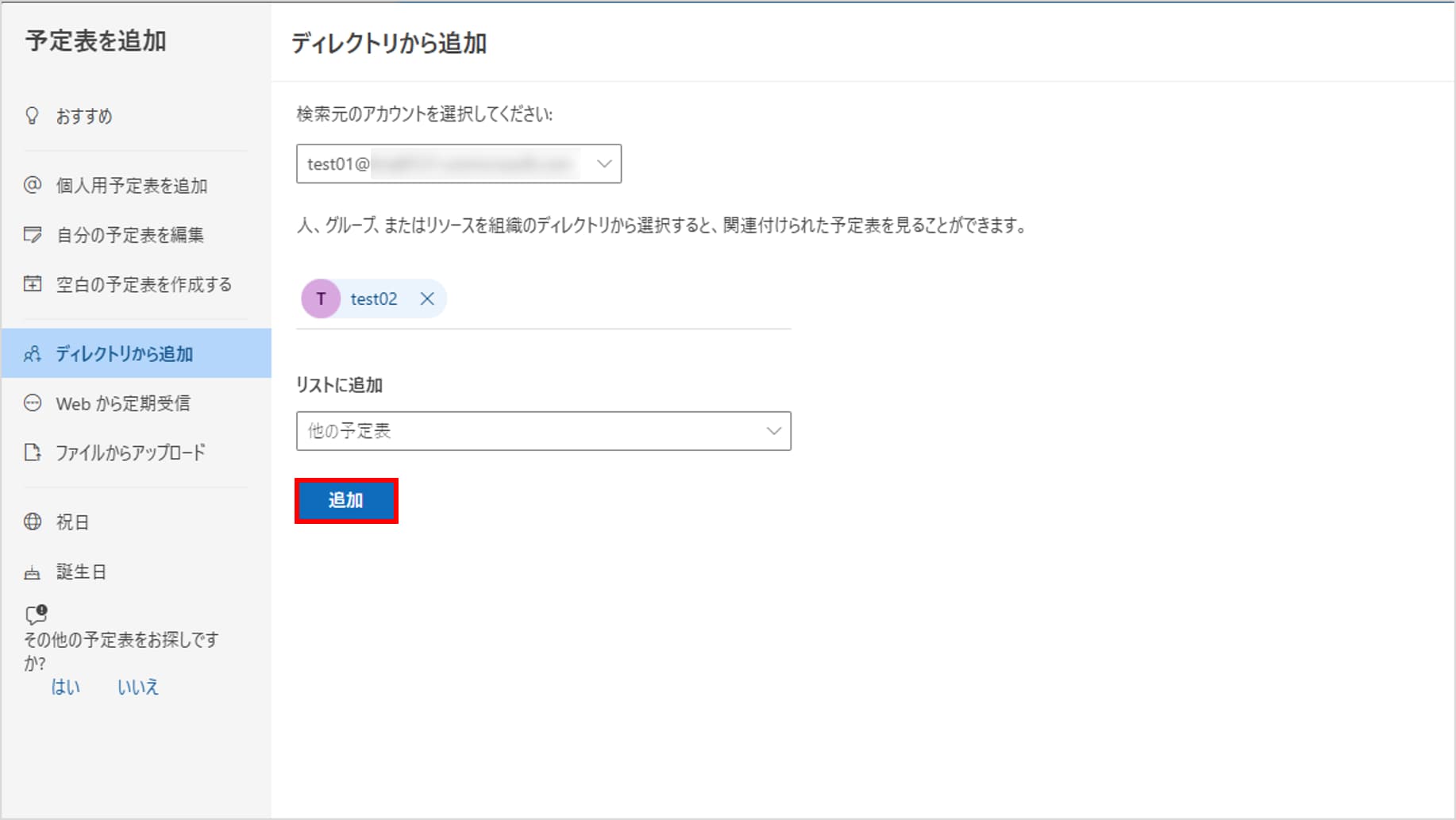 「追加先」のプルダウンで、表示させるグループ(通常は「他の予定表」や「ユーザーの予定表」)を選びます。